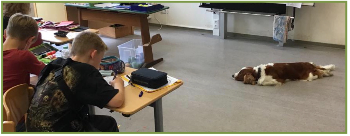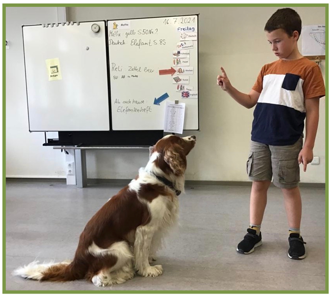 Am meisten Spaß macht es mir, wenn eine Schülerin oder ein Schüler für mich ein Leckerchen versteckt, das ich dann suchen darf. Dabei gibt mir ein Kind die Kommandos „Sitz“, „Bleib“ und „Such“. Ohne, dass sie es merken, können die Kinder ganz viel bei solchen Aufgaben lernen. Mit gegenseitigem Respekt können wir gut zusammenarbeiten. Mir macht die Arbeit in der Schule Spaß, aber sie ist für mich auch anstrengend. |