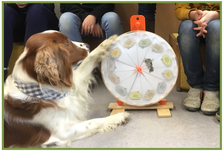 Ein Schulhund begleitet die Lehrkraft in die Schule und verbringt so den Unterrichtsalltag mit den Schülerinnen und Schülern. Ich gehe zur Zeit jeden Montag mit meinem Frauchen in den Religionsunterricht. Da ist immer einiges los! Zuerst begrüßen mich die Kinder liebevoll in einer „Schnupperrunde“ und dann darf ich manchmal ein paar Aufgaben übernehmen. Zum Beispiel habe ich für die Kinder schon an einem Glücksrad mit vielen Aufgaben gedreht. Das mache ich mit meiner Pfote. So kann ich beispielsweise auch würfeln oder mit meiner Schnauze Karten ziehen. |